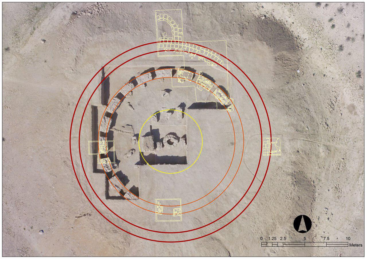 بنای ساسانی تنب پرگان در 2 کیلومتری جنوب شهر جناح در بخش باختری استان هرمزگان و به روی تپه ای به همین نام ( پرگان ) قرار گرفته است. ساختار کلی این بنا شامل یک بنای مدور داخلی، یک حصار خشتی در اطراف آن و در نهایت خندقی است که کل این مجموعه را احاطه کرده است. بخش اصلی ساختار مدور داخلی، شامل یک ساختار ایجاد شده با 20 عدد جرز سنگی است. قطر این سازه 80/16 متر و مساحت کل فضای داخلی آن 221 متر مربع است. هر کدام از جرزهای بیست گانه 8/1 متر درازا و در حدود 1متر پهنا دارند. جرزها به سبک معماری ساسانی با غوطه ور کردن سنگ در ملاط گچ ساخته شده و سطح بیرونی آن نیز با همین ملاط اندود شده است. بین هر دو عدد جرز بنا، یک درگاه با عرض متوسط 60 سانتی متر قرار گرفته است در میانه فضای مدور مذکور، یک فضای کوچکتر که متمایل به بیضی و ساخته شده با 12 عدد جرز سنگی است، قرار دارد. در نقطه مرکزی هر دو فضای مدور نیز یک ستون گرد به قطر 160 و ارتفاع 50 سانتی متر بازمانده که سطح بیرونی آن با ملات گچ اندود شده است. همچنین دو ستون مستطیل شکل نیز در دو پهلوی خاوری و باختری ستون گرد مرکزی قرار گرفته است. بنابر شواهد به دست آمده از کاوش بنا، به نظر می رسد که بر روی بخش مرکزی بنا گنبدی نسبتا مدور ( که بخشی از آوار آن در فضای باختری ستون مرکزی بنا به صورت کاوش نشده باقی گذاشته شده ) قرار داشته و ستون مرکزی بنا دقیقا در زیر این گنبد واقع بوده است. پایه های این گنبد بر روی 14 عدد ستون سنگی دایره میانی بنا قرار داشته است. یک پوشش نیم تاق مانند نیز فاصله بین جرزهای بیست گانه دایره بیرونی و گنبد مرکزی را پوشانده بوده است. در اطراف سازه مدور توصیف شده در سطور فوق یک حصار خشتی مدور که چهار نیم برج بیضی شکل در جهات اصلی شمالی، جنوبی، خاوری و باختری داشته وجود داشته است. در نهایت نیز یک خندق مدور با پهنای دست کم 7متر در اطراف بنا کنده شده است. تاریخ ساخت بنای مدور تنب پرگان با توجه به چند عدد سکه به دست آمده در جریان کاوش آن و همچنین سبک سفال ها و معماری بنا مربوط به دوره ساسانی است. این بنا با توجه به نقشه منحصر به فرد و جذاب آن دارای ارزش معماری قابل ملاحظه ای است و نمونه ای همانند با آن تاکنون شناسایی نشده است. در ارتباط با کاربری بنا نیز اگرچه هنوز پژوهش های کامل صورت نگرفته، با این حال، با توجه به بررسی دقیق شواهد معماری و همچنین دیگر یافته های بدست آمده، به نظر می رسد که ساختمان ساسانی تنب پرگان، توامان دارای کاربری علمی – رصدخانه ای و همچنین نیایشگاهی و آیینی بوده است.